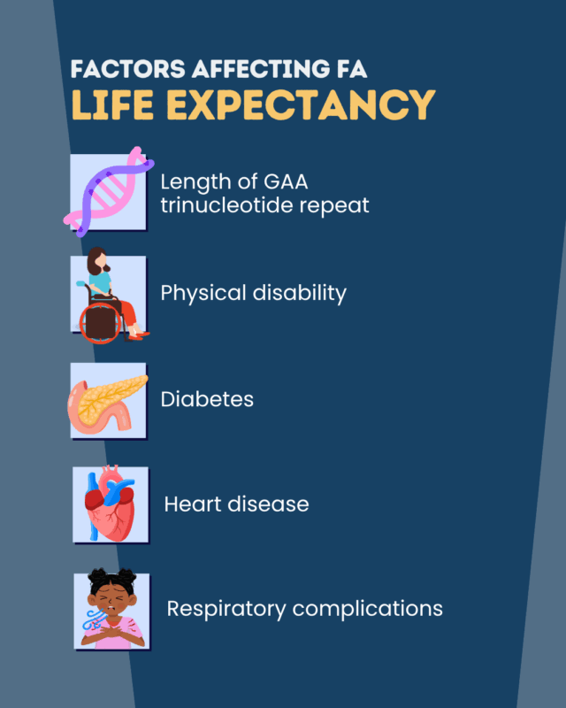Studies have also shown the risk of death is significantly increased in people with Friedreich’s ataxia who have heart disease, diabetes, more severe physical disability, and/or respiratory complications.